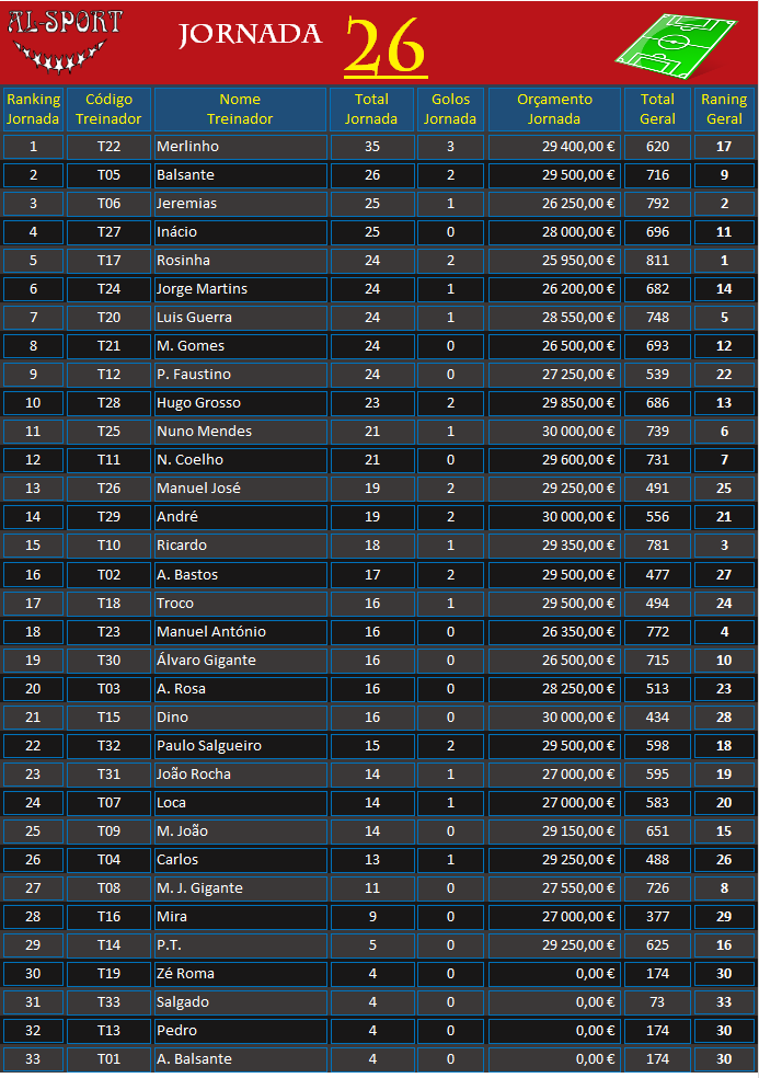 Classificação da 23ª jornada da XXV Liga Fantástica Al-sport 2019/2020, que se disputou á 27ª jornada da 1ª Liga.